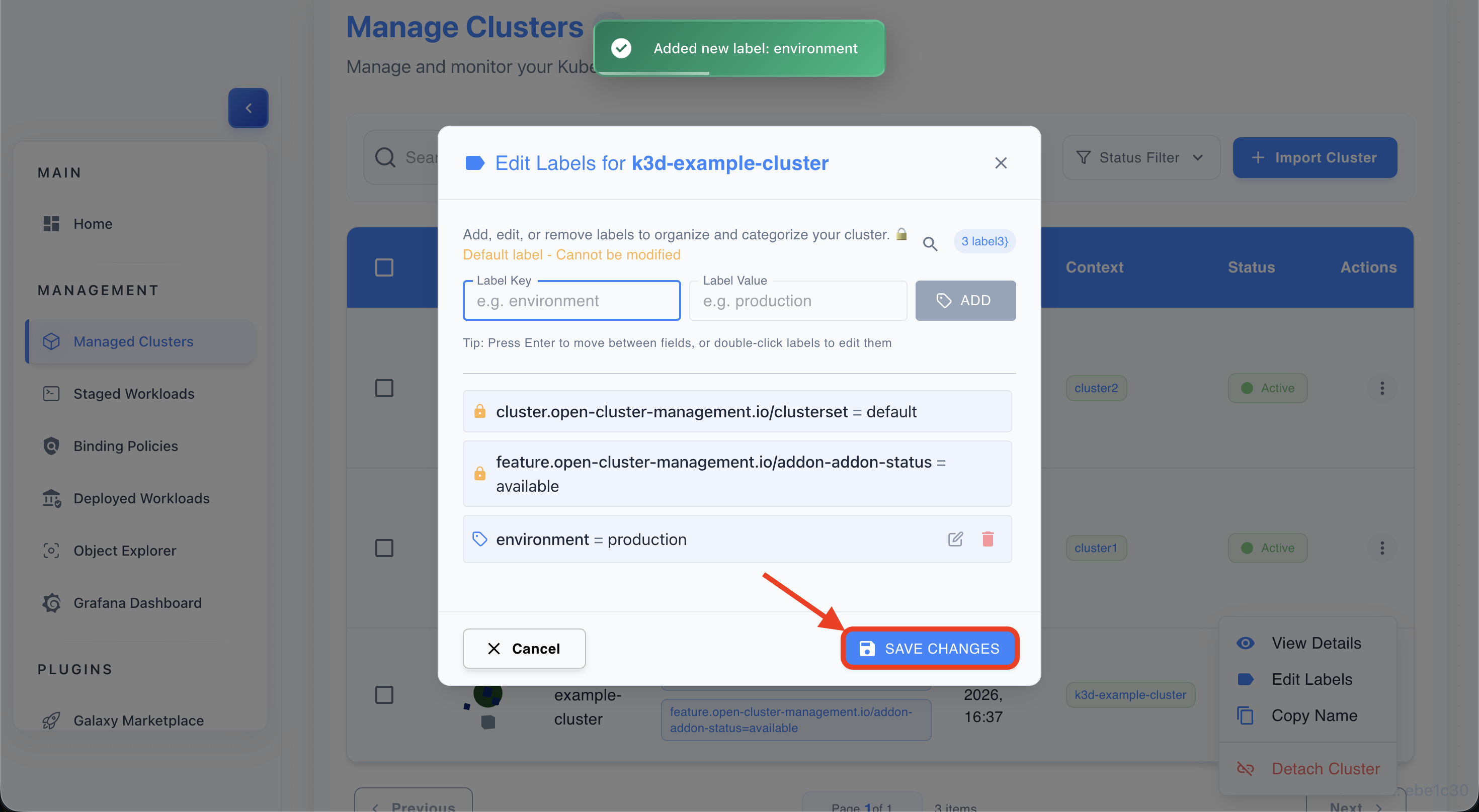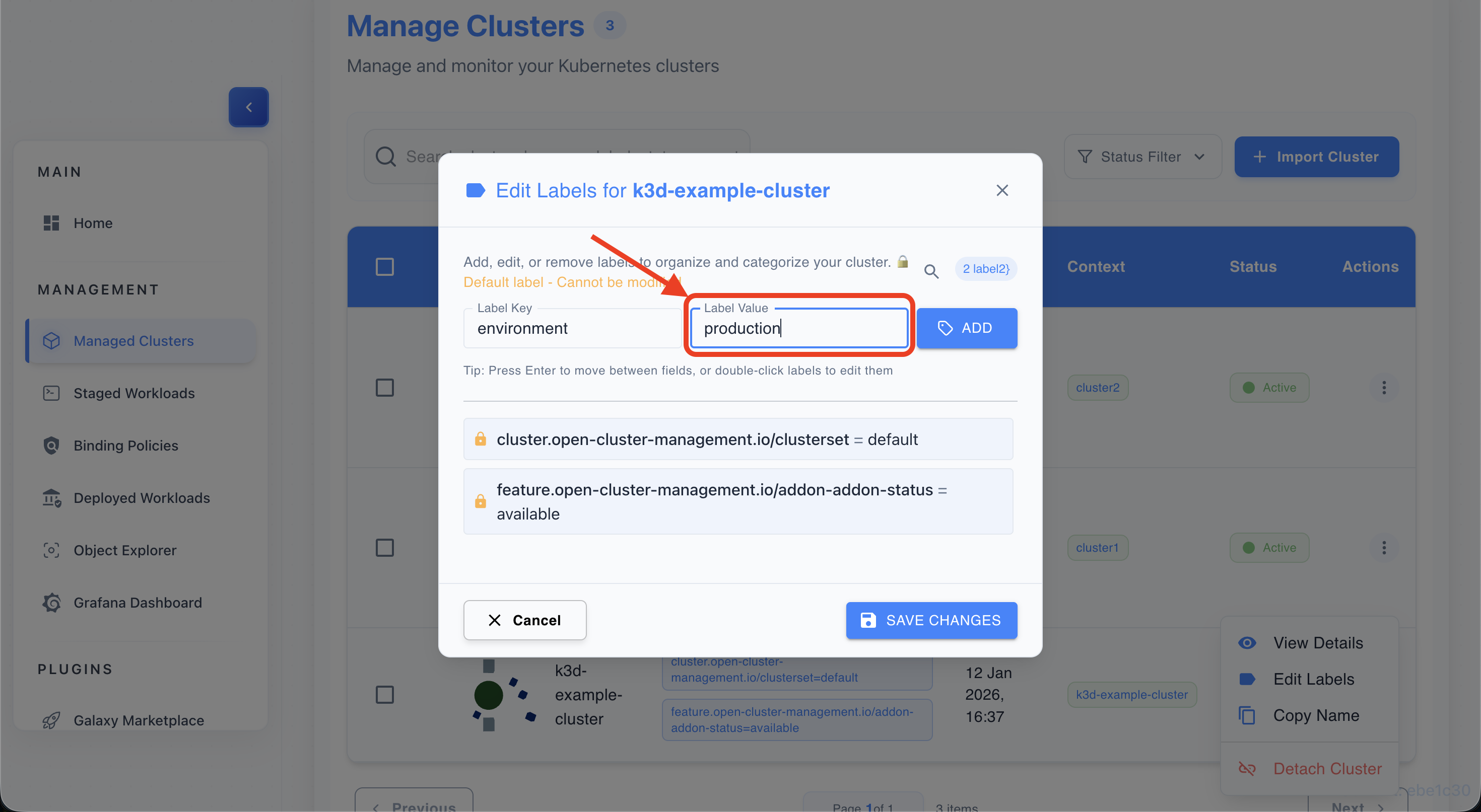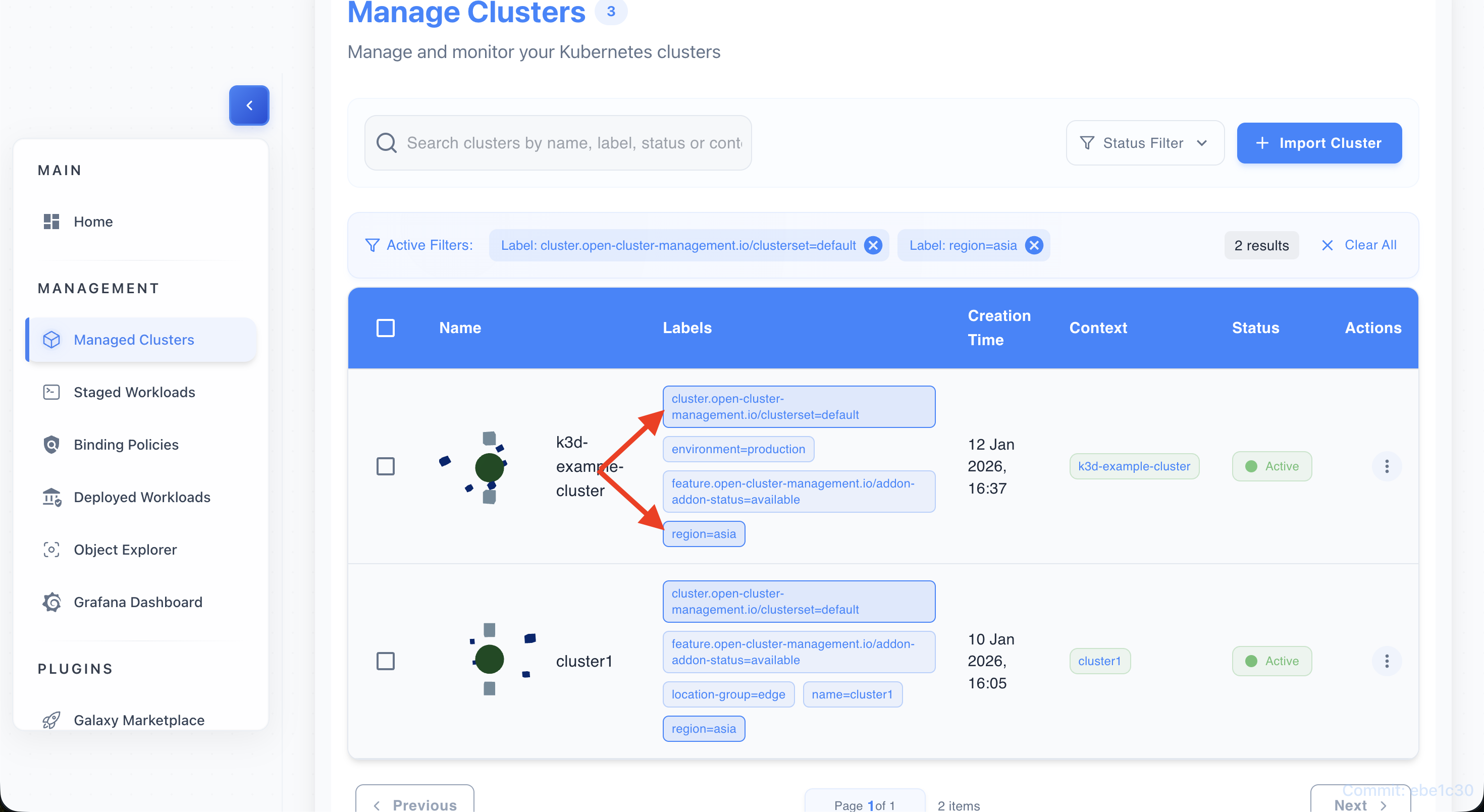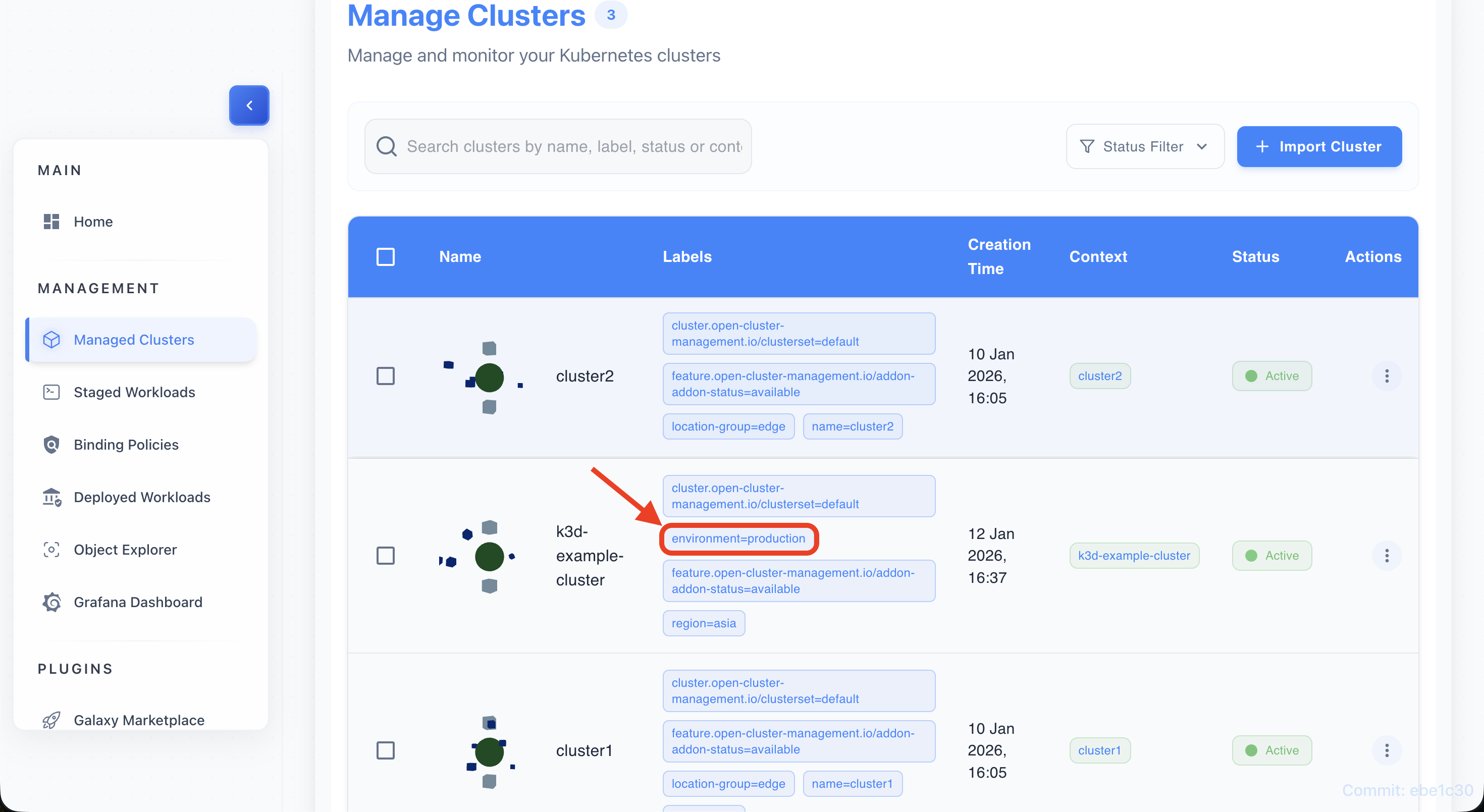 • Find a label chip (e.g., environment=production) on any cluster row.