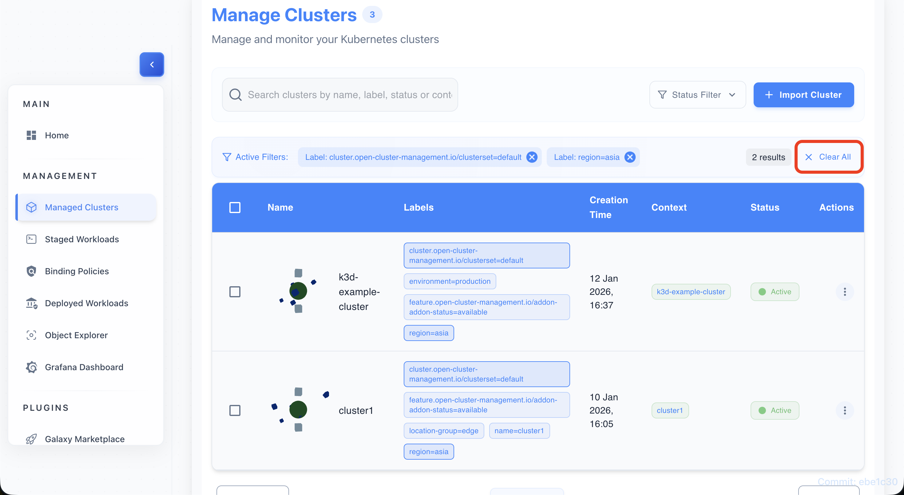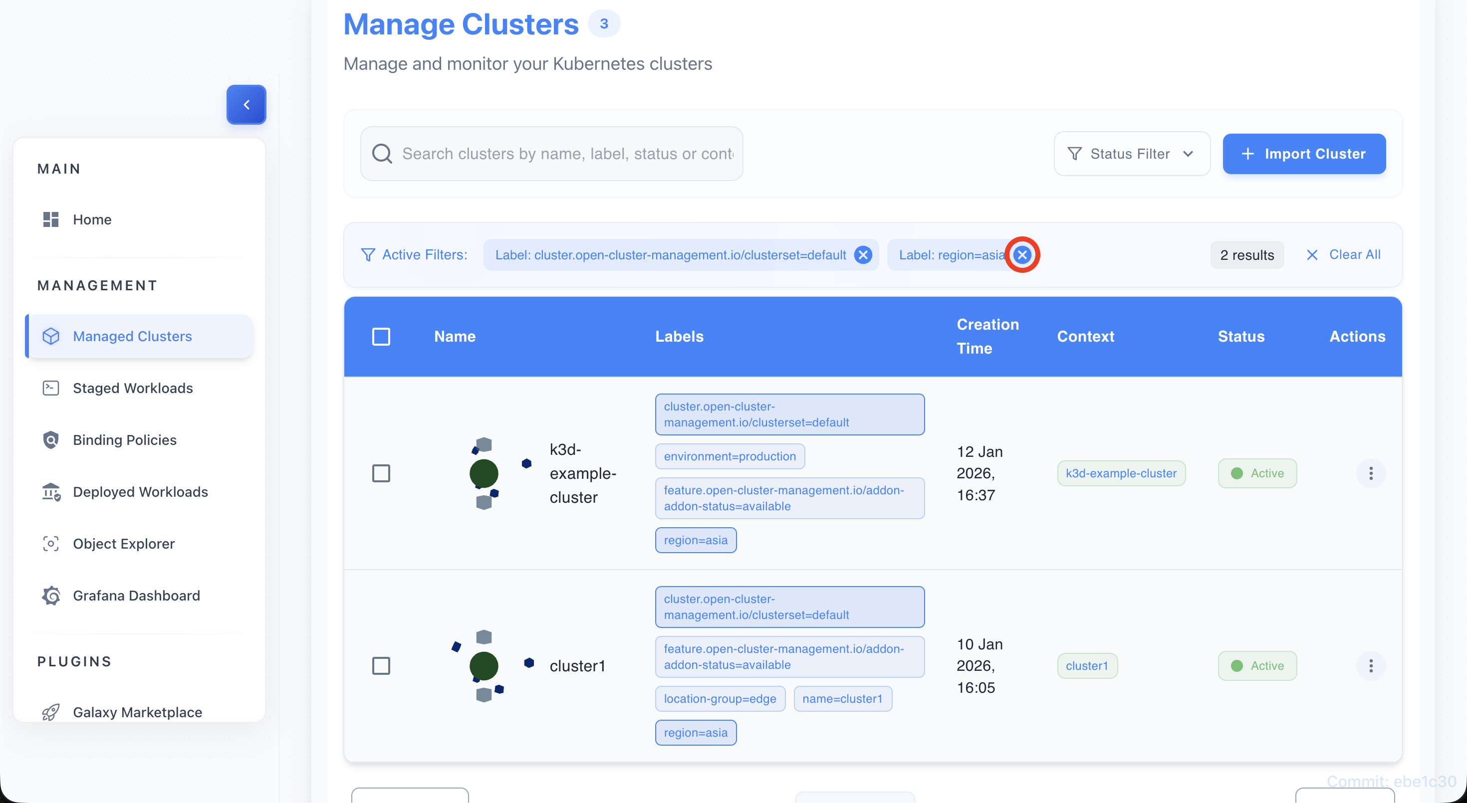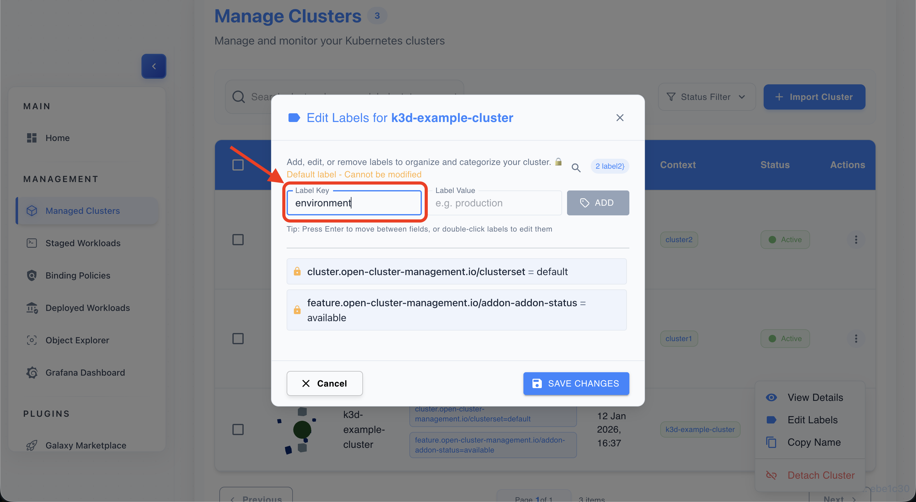 • Find a label chip (e.g., environment=production) on any cluster row.