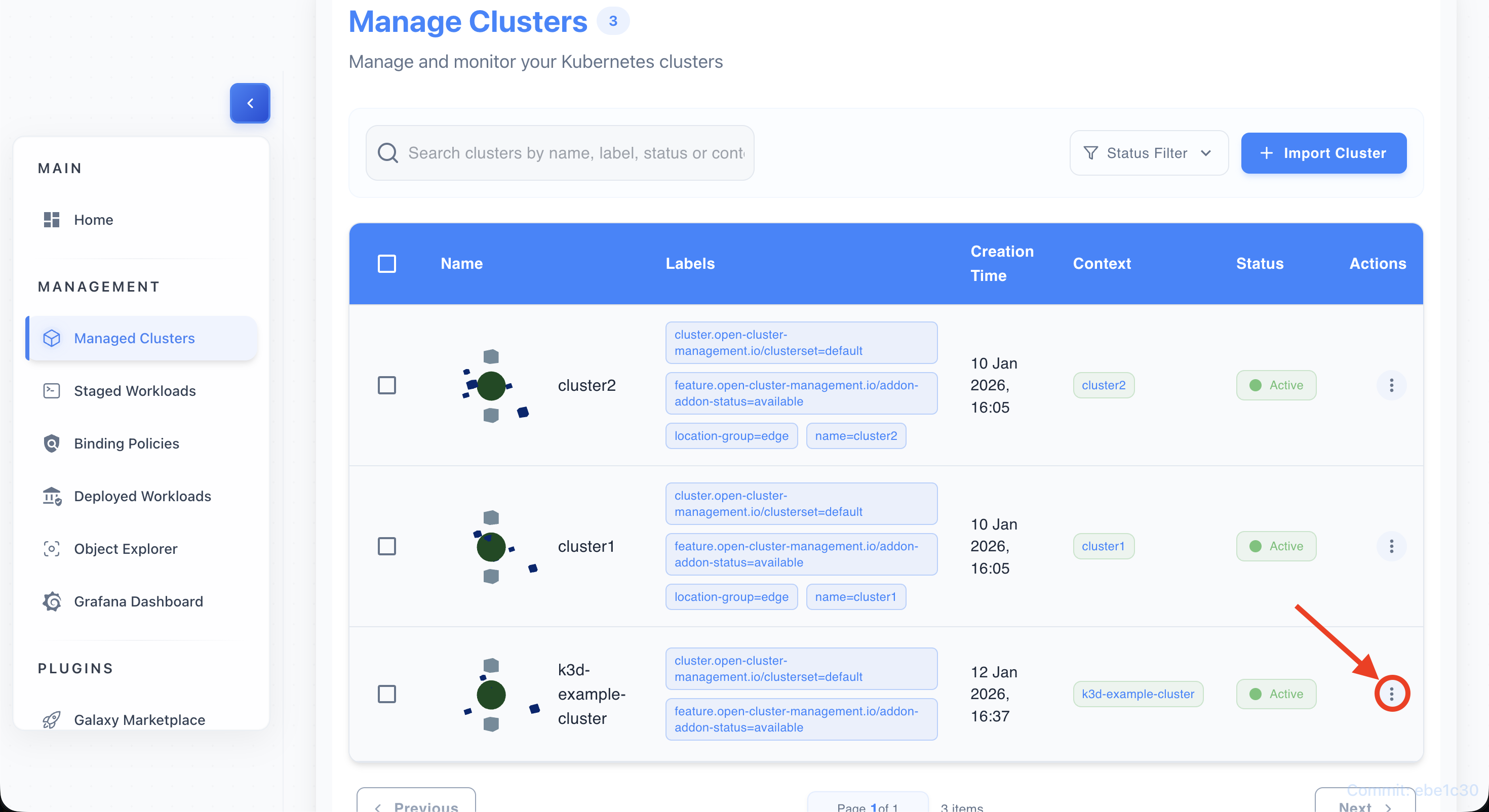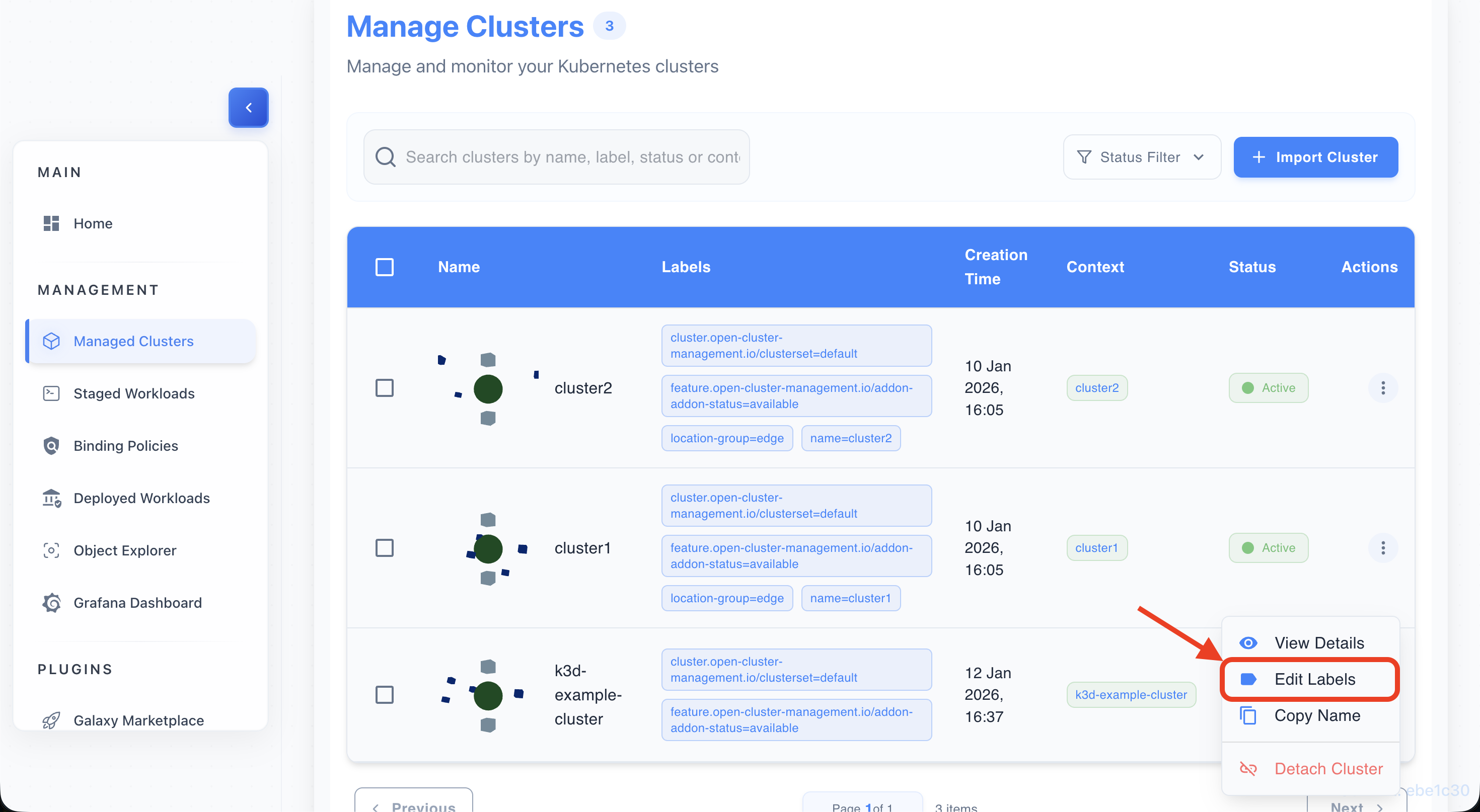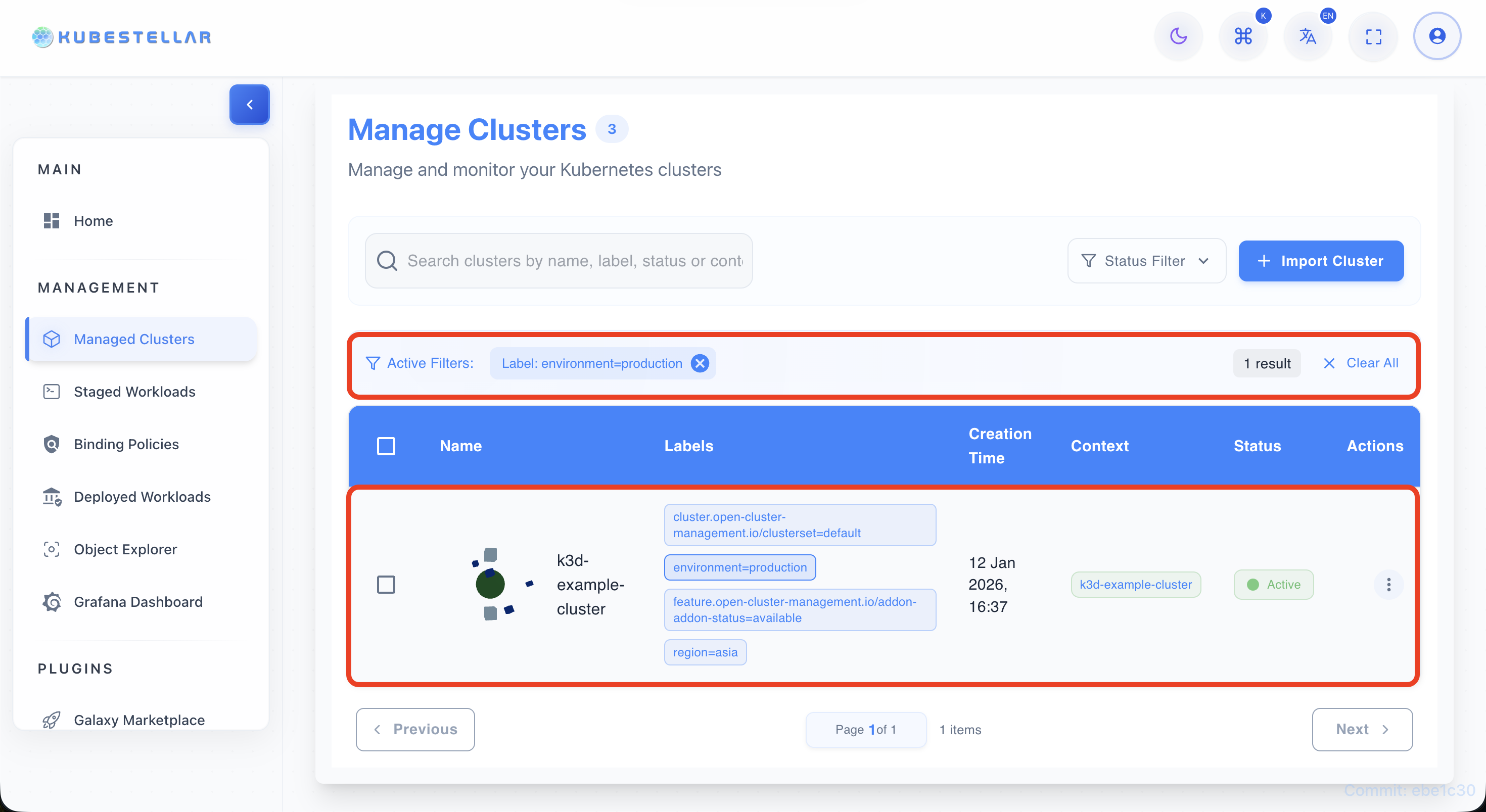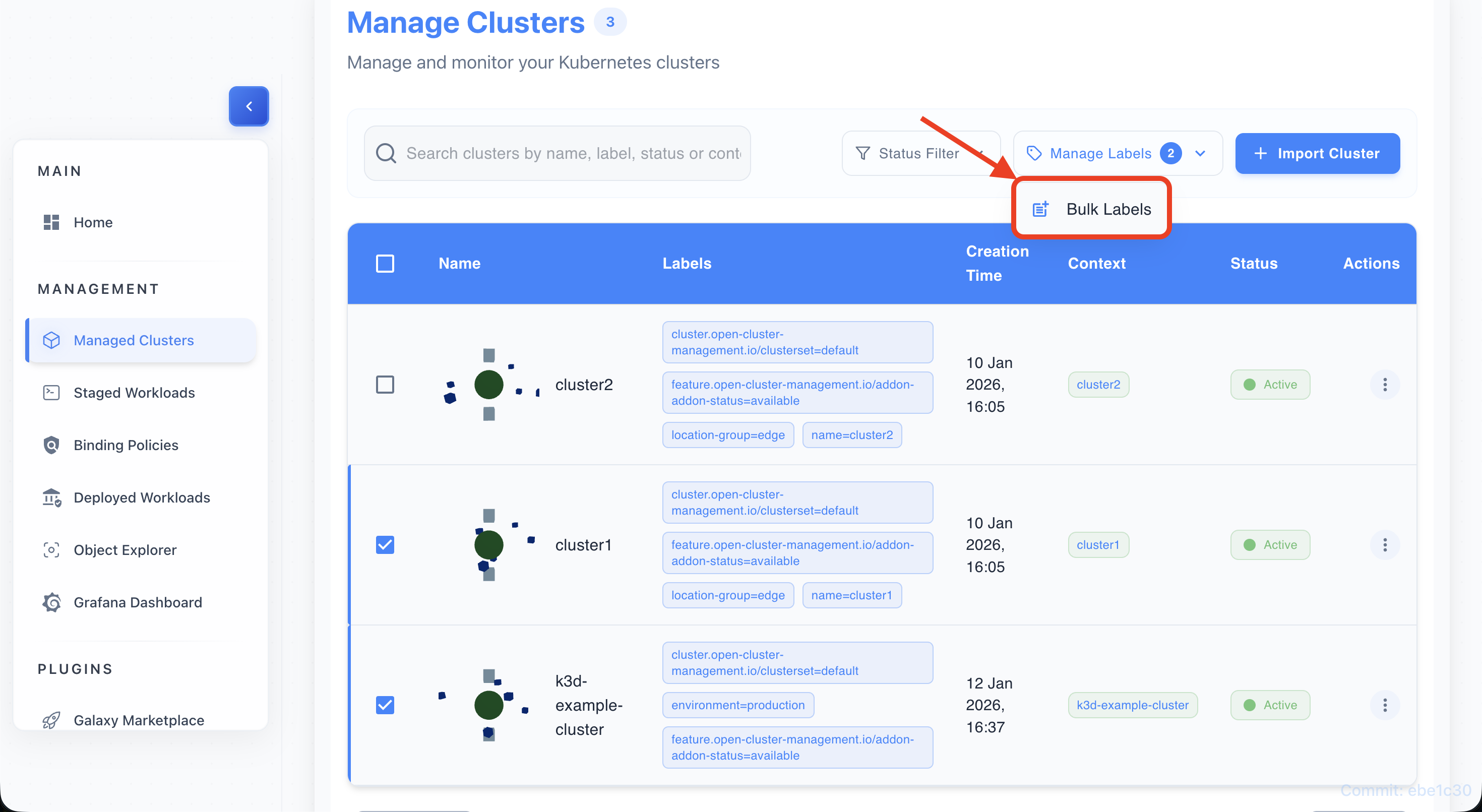 • Find a label chip (e.g., environment=production) on any cluster row.