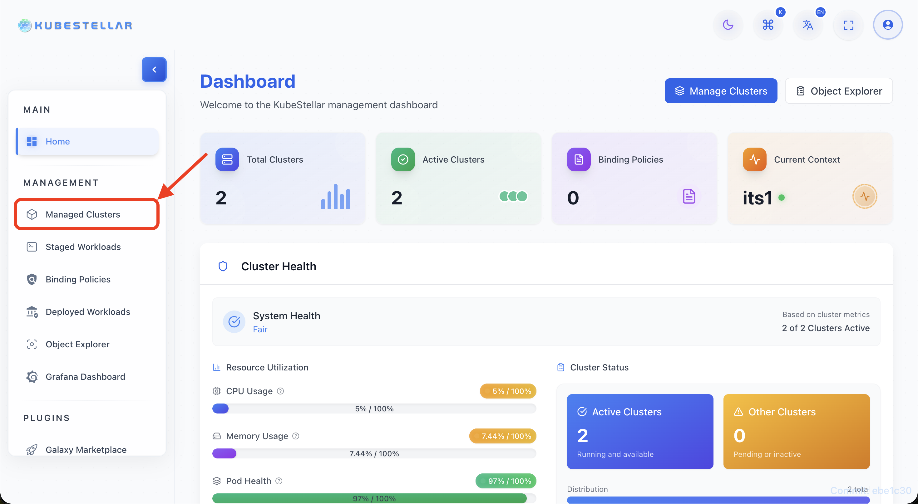 • Open the KubeStellar dashboard and select “Managed Clusters” from the main menu.
